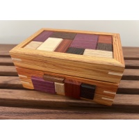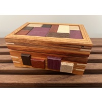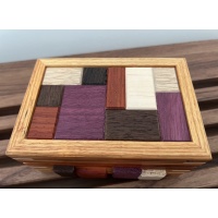 This creative design showcases each wood species in an eye catching and unique fashion.  Puzzle boxes are fun, rewarding to solve, and make a great gift for the inquisitive individual. Placing items in this box may interfere with the opening mechanism.  This puzzle box measures 6.25" long x 4.25" wide x 3" high. Wood puzzles are affected by humidity and should be stored between 40%-60% relative humidity to maintain proper function.