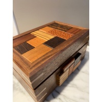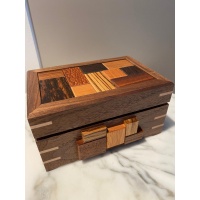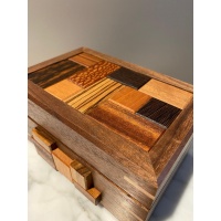 " Dee's widely acclaimed "Where's My Hammer?" Sequential Discovery Puzzle Box was his first offering on Cubicdissection. WMH is incredibly well crafted and packs a ton of puzzling value into a unique and attractive package. Multiple discoveries, unique mechanisms, and very unusual construction make this a must-have for serious collectors. This has a Black Walnut box with tiles made from Sapele, Cherry, Zebrawood, Leopardwood, Wenge, Genuine Mahogany, Bocote, and Morado. 44 copies available, each signed and dated. Ships assembled.” |