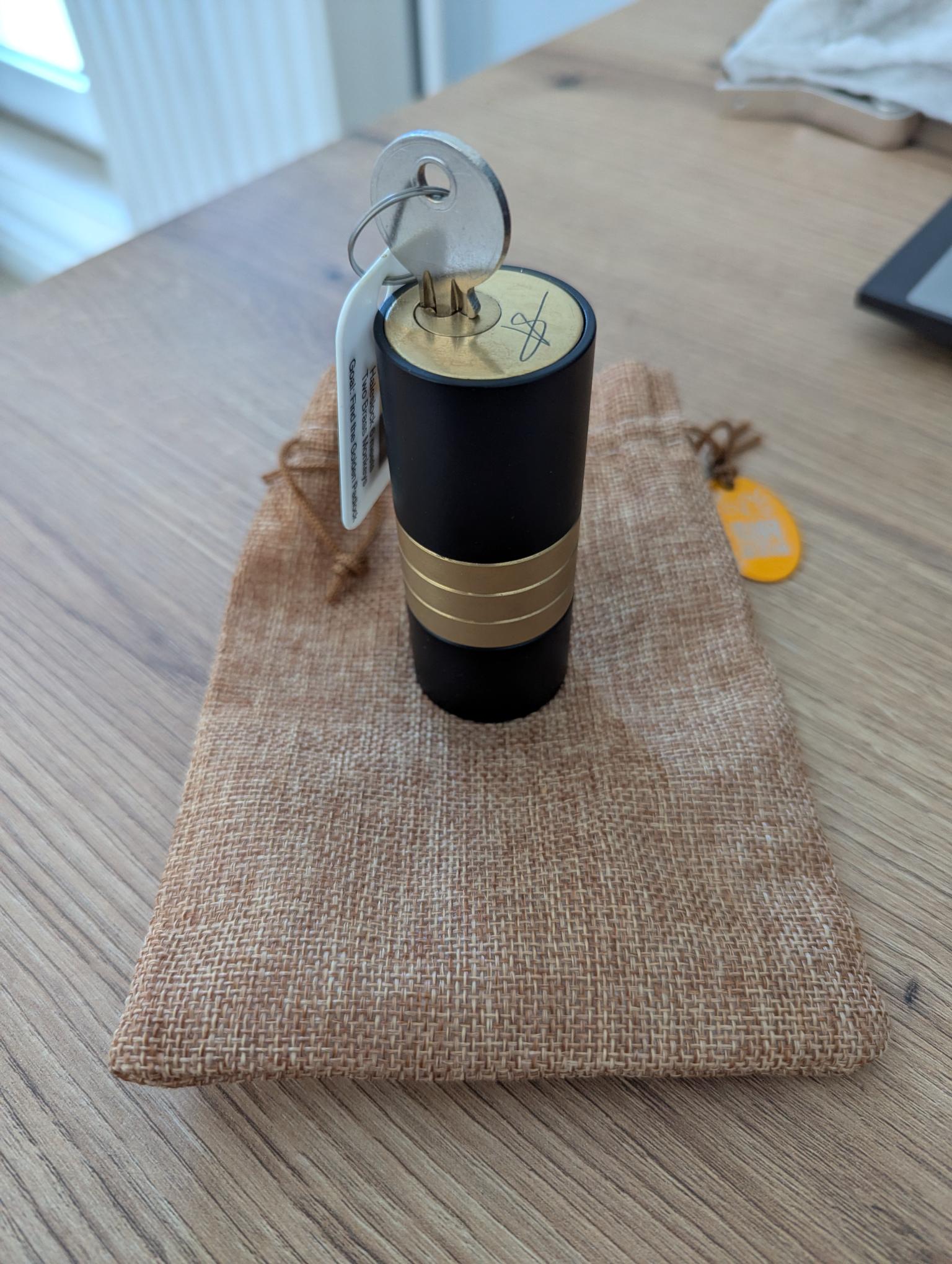 "Who Dares Wins" is a collaborative puzzle lock created by designer Shane Hales (HalesPuzzles) and Two Brass Monkeys (Steve and Ali). It features a modified Rim Cylinder lock (Haleslock 6) housed in a brass and anodized aluminum container. The goal is to solve the lock and reveal a hidden miniature golden padlock.