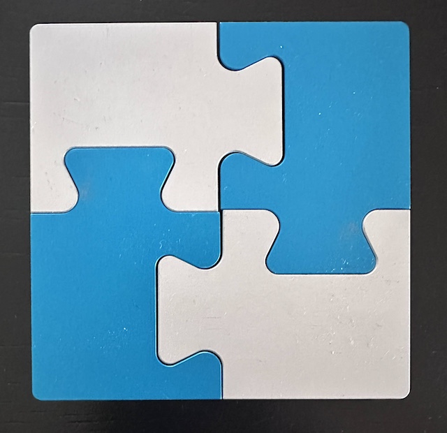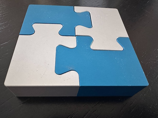 The object is to take apart the four jigsaw pieces and put them back together again.  Measurements are 3 in x 3 in x 0.6 in.