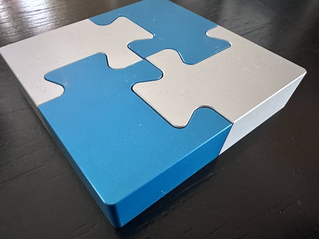 This is a high quality metal puzzle designed by Wil Strijbos, with beautiful blue and silver pieces is made from anodized aluminum.