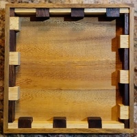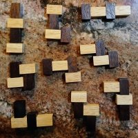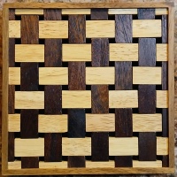 Frame plus nine pieces. Wooden puzzle with checkerboard / basket weave like appearance in solved state. Size: 14.5cm x 14.5 cm x 2cm (~5.5" square).
