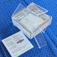 The puzzle comes with 19 of the 20 rectangular pieces incorrectly placed in the box, along with a small key piece that looks like the blades of a windmill. The goal is to pack the 20 rectangles and close the lid. The lid of the box is composed of four hinged panels. Once the puzzle is solved, close the panels and “lock” them with the windmill key piece. Each layer of the packed box is unique."